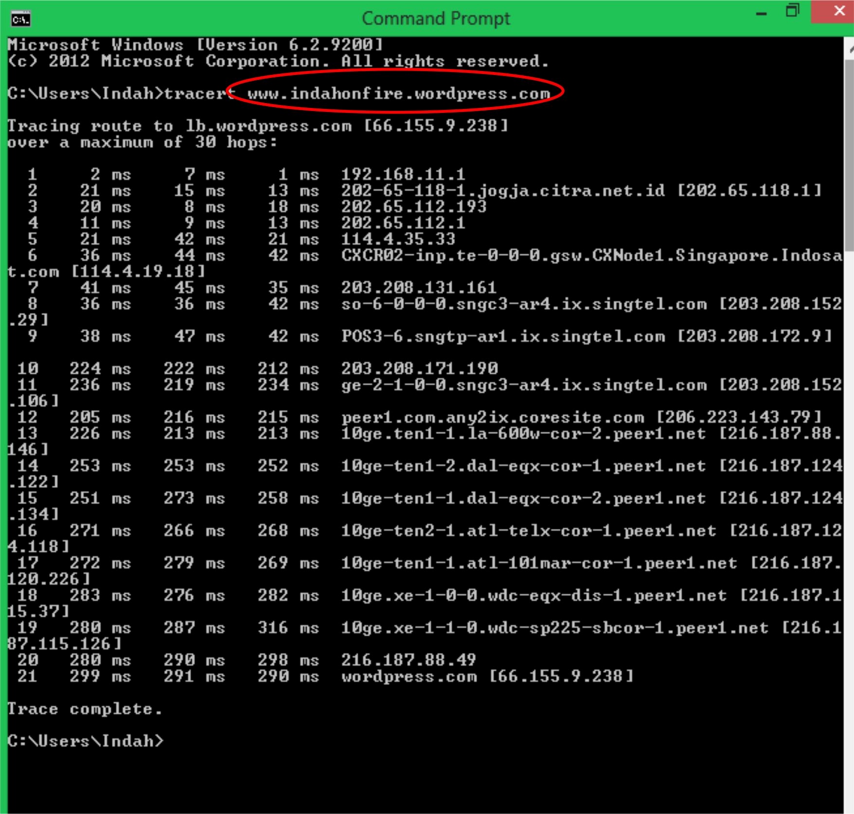 Pada tugas kali ini, kami akan membahas tentang Trace Route atau rute-rute yang dilewati dalam mengakses sebuah alamat web. Dalam pembahasan ini alamat yang diakses adalah www.indahonfire.wordpress.com dan febriana.net63.net. Untuk menentukan alamat alamat ip, kami menggunakan Command Prompt dengan menggunakan perintah tracert alamat web yang dituju. Untuk lebih jelasnya dapat dilihat pada gambar dibawah ini J