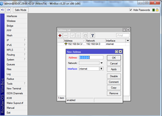 Setelah itu beri IP address pada Virtual Ethernet yang satu jaringan dengan Internet (ether1).